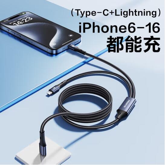 双Type-C数据线二合一PD60W充电线一拖二车载适用苹果iPhone16pro/15/14手机华为70小米笔记本ipad